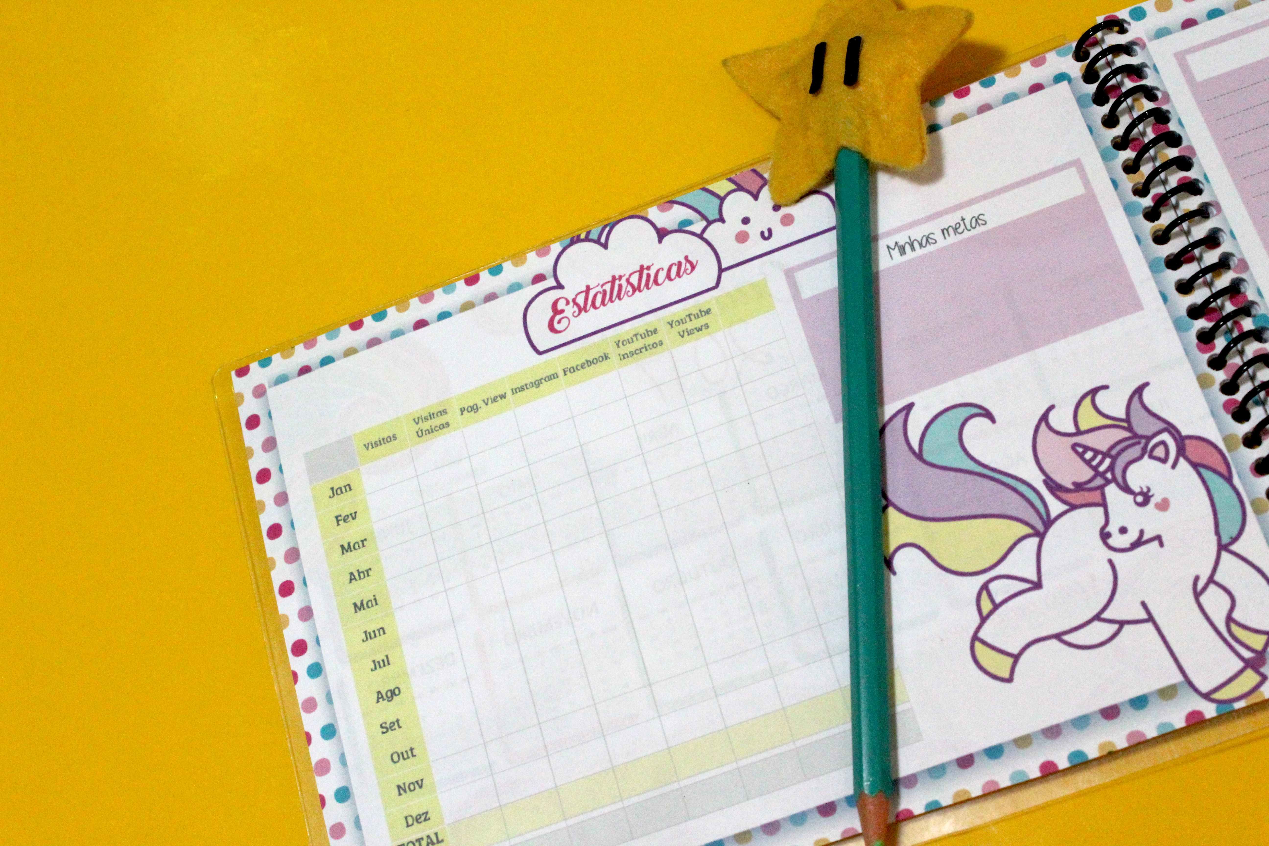 A ideia é que vocês possam se organizar de forma fofinha, deixei espaços para colocar as estatísticas do blog e das mídias sociais, tem espaço para você colocar suas metas, isso é importante para que você possa visualiza-las diariamente, assim podemos alcançar mais rapidamente nossos objetivos, deixei espaços para colocar os filmes e livros que precisamos ler durante o ano e muito mais…