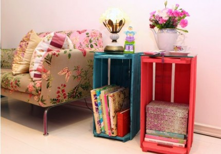 Ao lado do sofá, minha ideia é fazer duas mesinhas com caixotes, vou adaptá-los e pintá-los de branco e colocar dois abajur em cima, vai ter vídeo mostrando também.