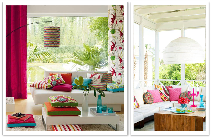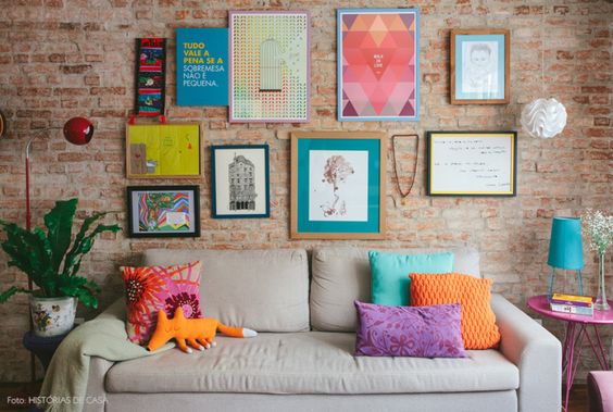 Minha ideia é usas e abusar de almofadas coloridas, como minha dúvida é muito grande vou comprar várias capas de almofadas, seja elas em cores fortes e pastéis, posso ir trocando com o passar do tempo, o importante é abusar de modelos e cores. Já na parede em cima do sofá, como nas imagens, quero colocar vários quadros com moldura branca e imagens fotos da minha família, lugares, inspirações e coisas geeks sei lá… isso vou pensando mais para frente! rs