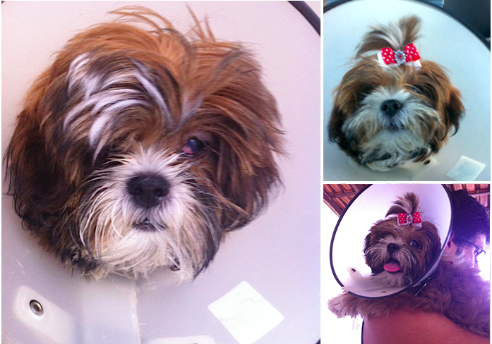 Sobre a cirurgia da Cherry Eyes – Prolapso da Glândula Lacrimal dela foi de recolocação dessa danada da terceira pálpebra que insiste em aumentar o tamanho e inflamar, acontece em muitos casos com as raças pequenas ou de médio porte, como Boston Terriers, Cocker, Bulldogs, etc… É importante procurar ajuda veterinária, essa glândula é responsável por até 50% da lágrima e pode crescer o suficiente para impossibilitar o seu animalzinho a fechar o olho completamente e isso pode causar ressecamento, enfim pessoal, não sou especialista no assunto mais estou dividindo um pouco do que aprendi. Após a cirurgia aplicando um colírio de manhã e de noite por 10 dias, percebemos o olhinho dela com uma ponta de linha e azul, após 7 dias da cirurgia observávamos que ela não aparentava melhoras, fomos para o veterinário e foi constatado ulcera de córnea, lá foi mais 10 dias de tratamento, mais com 2 dias de tratamento ela era outra cachorrinho vou colocar a foto abaixo para vocês compararem